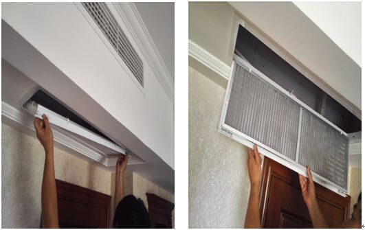 從出風(fēng)口和回風(fēng)口處取下的過濾網(wǎng),要用水沖洗至潔凈,可用小刷子搭配清潔劑仔細清潔。將清洗好的過濾網(wǎng)放在背光處晾干,然后將過濾網(wǎng)重新裝回出風(fēng)口,面板在吊頂上固定好,恢復(fù)風(fēng)口原狀。