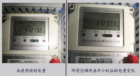 通過很直觀的數(shù)據(jù)我們可以了解到,開啟所有空調(diào),半小時的耗電量僅為(3123.71-3121.32)-(3121.32- 3121.25)×3=2.18kwh。僅開啟一臺測試空調(diào),半小時耗電量僅為(3124.81-3123.71)-(3121.32- 3121.25)×3=0.89kwh,一小時耗電約為1.78kwh左右。