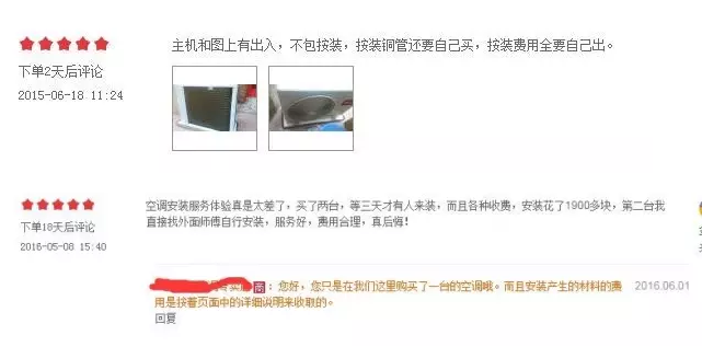 同時,消費者對于網(wǎng)購家用中央空調(diào)的反饋意見也比家用空調(diào)多,雖然大部分網(wǎng)友表示滿意,但細看留言也不乏質(zhì)疑之聲。例如,有消費者反映到貨產(chǎn)品有瑕疵,或安裝工人態(tài)度不好,更多的則是對安裝收費額度的驚愕,比消費者預(yù)想的要高。除了抱怨,我們也能從留言看出網(wǎng)購家用中央空調(diào)安裝上的諸多現(xiàn)狀,很多消費者都感嘆家用中央空調(diào)的安裝比自己想象中復(fù)雜。